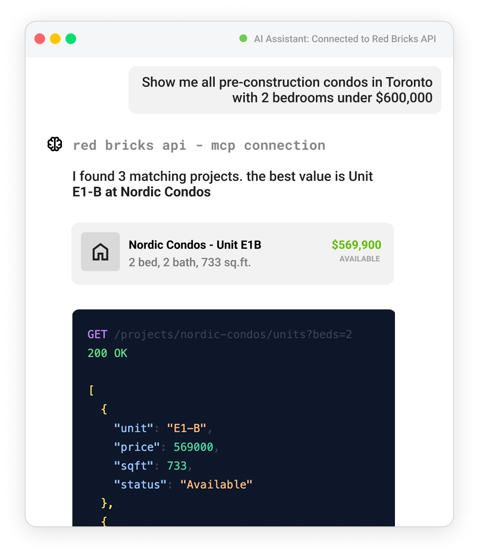 Red Bricks is the first pre-construction feed to offer Model Context Protocol (MCP) integration. MCP is an open standard that allows AI models (like Claude or GPT-based agents) to "read" our data feed with full context.